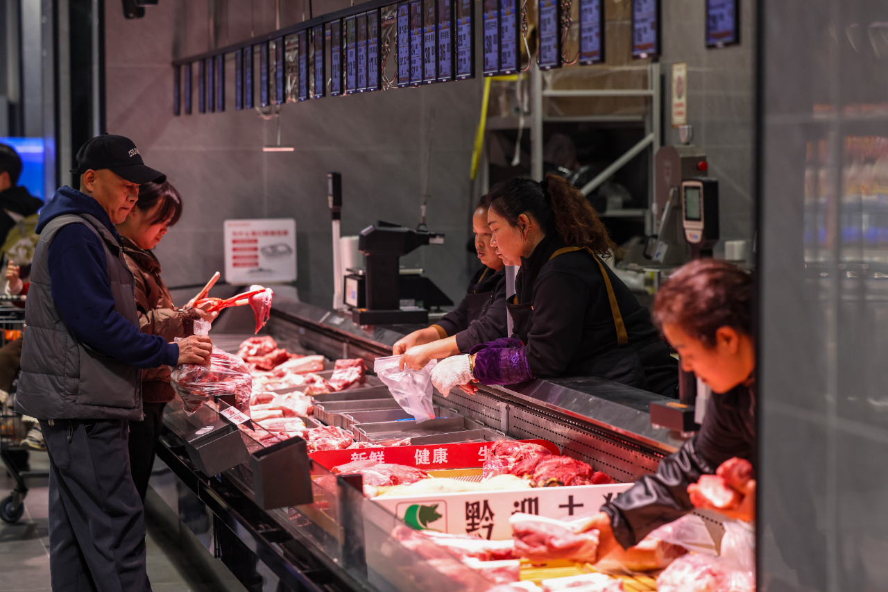 图为贵州铜仁一家超市内,消费者正在选购猪肉。(图片由CNSPHOTO提供)