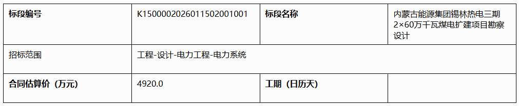 内蒙古能源集团锡林热电三期2×60万千瓦煤电扩建项目勘察设计招标
