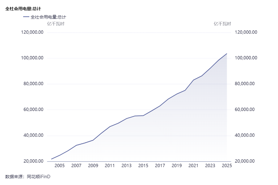 从国内来看,全社会用电量正从“温和爬坡”切换为“陡峭拉升”。国家能源局最新月报显示,2025年1—11月全国累计用电8.94万亿千瓦时,同比+7.2%,增速创2012年以来同期峰值;即便在高基数效应下,电网调度口径仍把2026—2028年复合增速锚定在6.3%—6.8%,远高于2016—2020年4.2%的平均值。