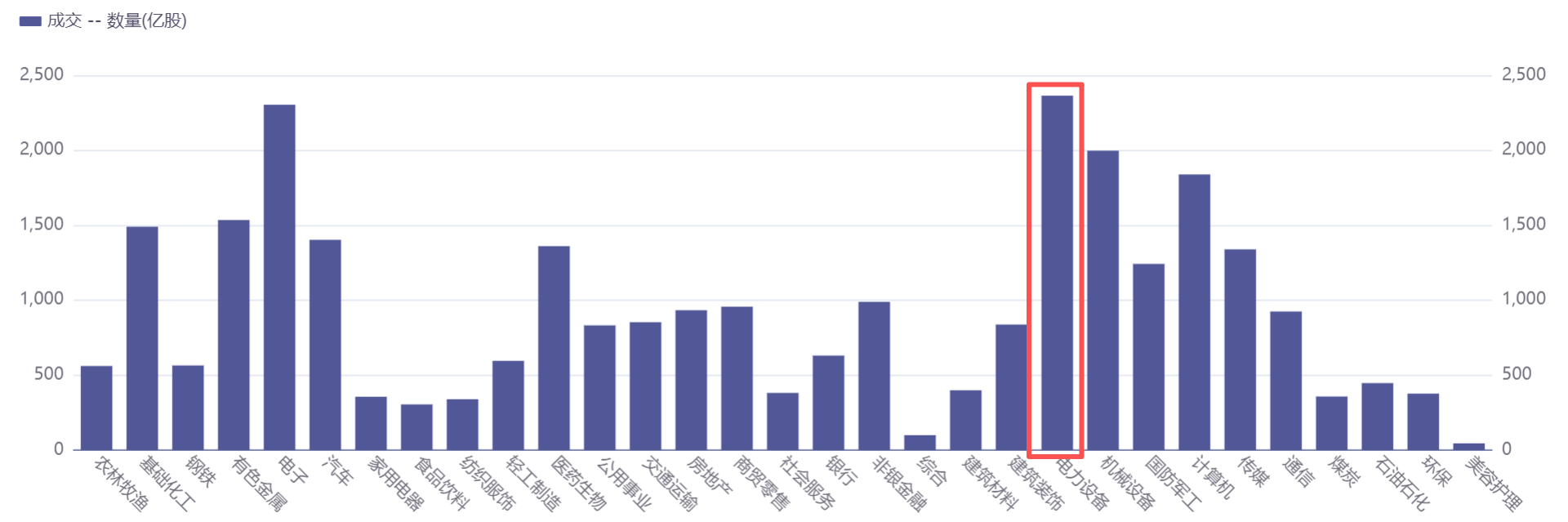 从市场成交量看,电力设备的活跃度明显提高。近一个月电力设备已经超越电子行业,成为成交最活跃的板块,这也从侧面反映出了当下资金对于电力赛道的关注与热情。