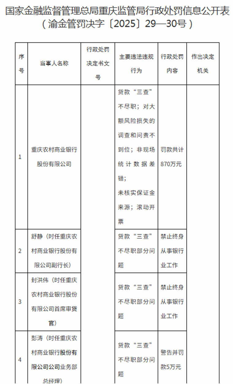 此次处罚直指重庆农商行信贷审核领域的核心问题:贷款“三查”(贷前调查、贷时审查、贷后检查)流于形式。监管部门明确指出,该行存在非现场统计数据差错、未核实保证金来源、滚动开票等违规操作,导致大额风险损失未能及时处置。时任副行长舒静、首席审贷官封洪伟被终身禁止从事银行业工作,另有8名中层管理人员分别受到警告、罚款处分,其中4人被警告并罚款5万元,1人单独罚款5万元,3人仅被警告。