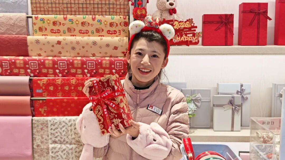 永辉北京鲁谷店的礼盒专区,一位年轻顾客正在仔细比较两款坚果礼盒。她最终选择了永辉与森宝联名的“骏马献瑞”礼盒,“设计有年味,品牌也熟悉,价格很合适”。不远处的服务台前,工作人员正熟练地为顾客选购的草莓和车厘子进行礼品包装。红色礼盒配上金色丝带,旁边还有一张手写的祝福卡片——这是永辉今年新增的“手写祝福”服务,让标准化商品多了份人情温度。
