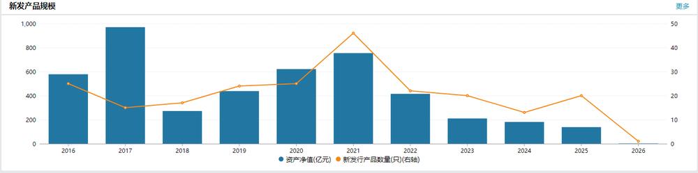 新发产品表现直观反映市场认可度变化。自2021年起,工银瑞信新发产品规模逐年走低,叠加存量产品资金赎回压力,进一步拖累整体规模增长。其中,主动权益类业务的萎缩成为核心拖累,该板块作为衡量基金公司投研实力的关键领域,持续拖后腿。