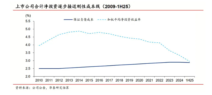 华泰证券研究报告显示,到2025年上半年,上市保险公司加权平均净投资收益率已经接近保证负债成本了。