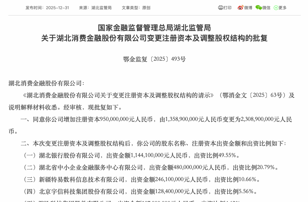 国家金融监督管理总局湖北监管局发布关于湖北消费金融股份有限公司变更注册资本及调整股权结构的批复。据《湖北消费金融股份有限公司关于变更注册资本及调整股权结构的请示》(鄂消金文〔2025〕63号)及说明解释材料收悉。经审核,同意你公司注册资本增加9.5亿元人民币,由原来的13.589亿元人民币提升至23.089亿元人民币。