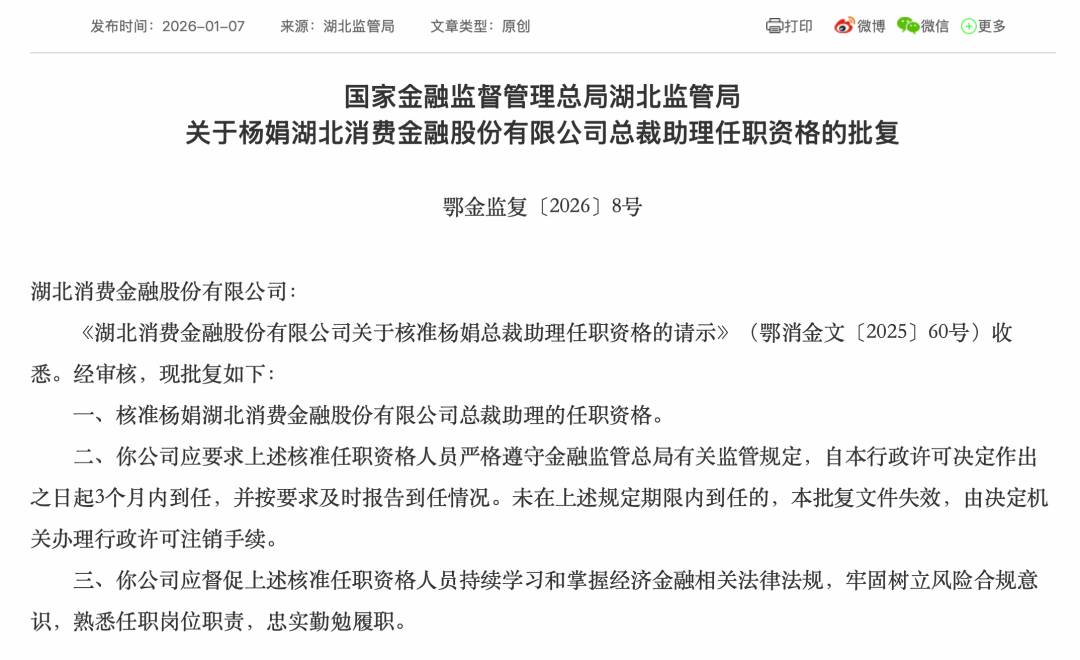 无独有偶,国家金融监督管理总局湖北监管局发布关于杨娟湖北消费金融股份有限公司总裁助理任职资格的批复。据《湖北消费金融股份有限公司关于核准杨娟总裁助理任职资格的请示》(鄂消金文〔2025〕60号)收悉。经审核,核准杨娟湖北消费金融股份有限公司总裁助理的任职资格。同样,公司需按上述类似要求对杨娟进行管理和监督。