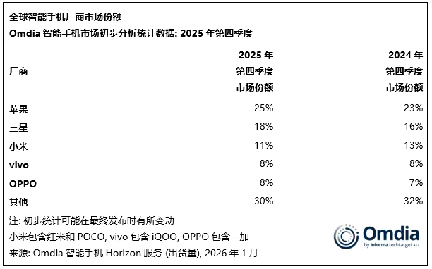 在全球市场上,据Omdia数据,2025年第一季度,传音被小米、OPPO、vivo反超,跌出全球出货量前五,沦为“其他”,2025年第三季度短暂重回第四的位置,但最新的2025年第四季度数据显示,传音又重回“其他”,不见踪影。