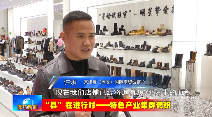 京津冀(固安)国际商贸城商户许涛:从最早的福海100多平方米,现在我们店铺已经将近有300平方米的面积,所以到了这个地方过后,整体都是比较良好,每一年(销量)有所逐步上升。