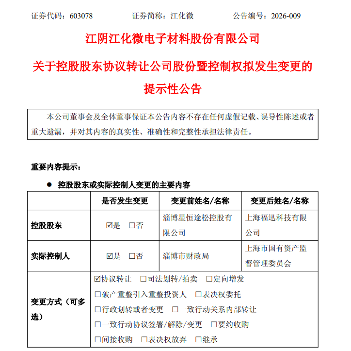 江化微表示,本次股份转让不会影响公司的正常经营。若本次交易顺利完成,将导致公司控股股东及实际控制人发生变化,公司控股股东将由淄博星恒途松变更为上海福迅科技,实际控制人将由淄博市财政局变更为上海市国资委。经公司向上海证券交易所申请,公司股票将于2026年1月20日(星期二)开市起复牌。