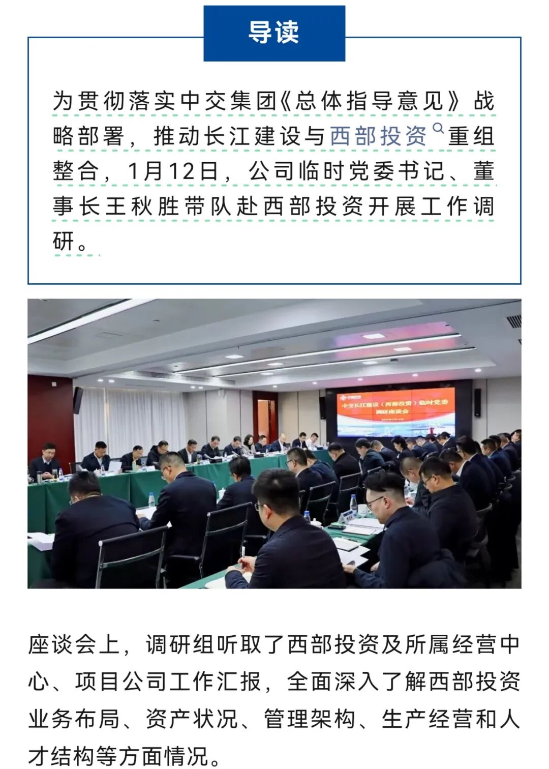 2026年1月12日,中交长江建设发展集团董事长王秋胜带队赴中交西部投资公司开展工作调研。