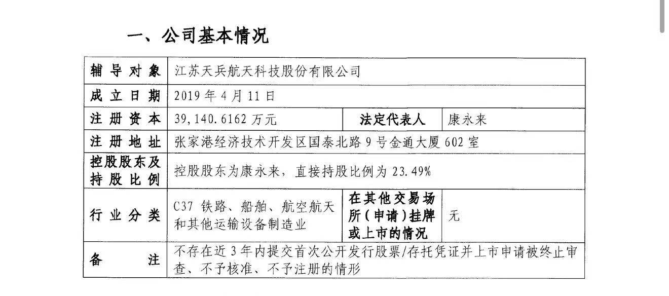辅导备案报告显示,天兵科技注册在张家港经济技术开发区,注册资本为3.91亿元;控股股东为康永来,直接持股比例为23.49%。