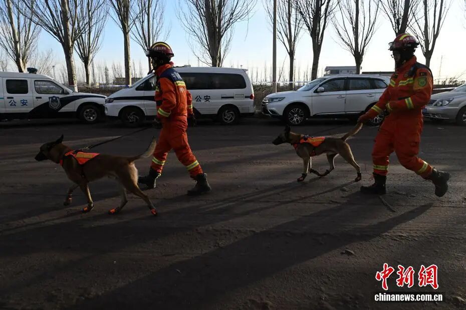 1月19日,包钢板材厂爆炸事故现场,搜救犬参与搜救工作。中新社记者刘文华摄