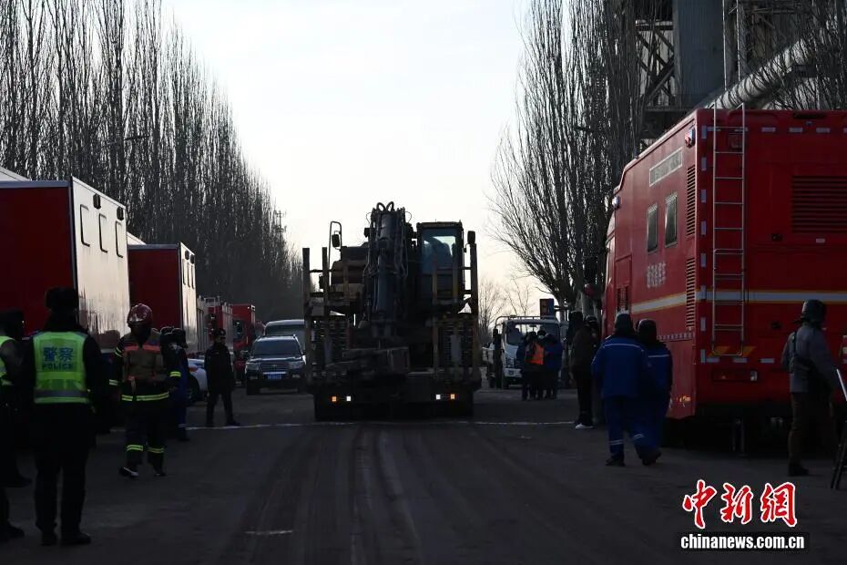 1月19日,包钢板材厂爆炸事故现场,车辆运输工程机械参与现场救援。中新社记者刘文华摄