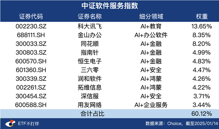 从其跟踪的中证软件服务指数来看,成分股覆盖AI的多个细分领域,比如教育、金融、办公软件等,像一个AI应用落地的通用底座。