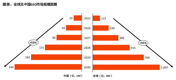 另外,根据天风证券的预测,预未来五年GEO年复合增长率将超50%,全球市场规模将从2025年的112亿增长至2030年的1007亿,这里面的增长空间非常大。