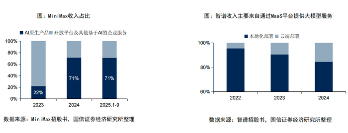 而智谱则更偏向B端,以MaaS平台为核心,提供本地化部署与云端部署服务,会更偏“项目制交付”,目前机构客户也已经超过8000家。其收入中超过90%来自B端,且近九成来自国内市场。