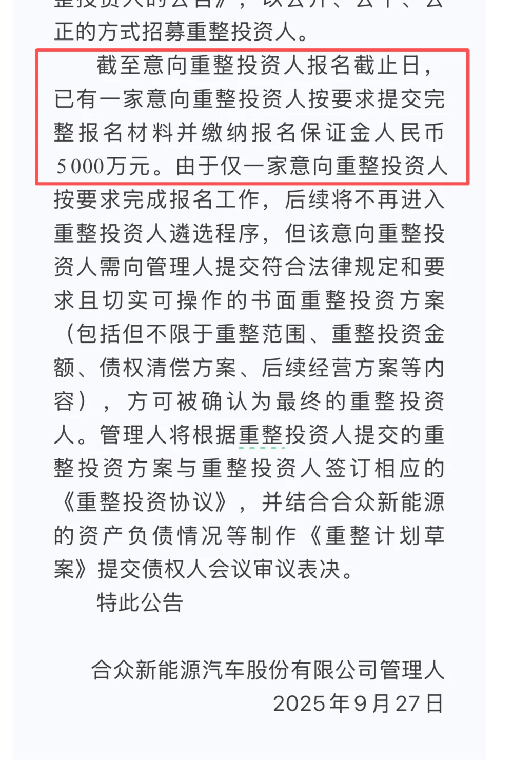 2025年9月,合众新能源管理人对外披露,破产重整程序唯一合格意向投资人完成报名,该主体已提交完整材料并缴纳5000万元保证金,进入方案谈判阶段。尽管有多家媒体将该意向投资方指向山子高科。然而,山子高科官方后续多次表示“还未最终确定”、“需以管理人公布为准”。截至目前,合众新能源管理人,以及受理该案的嘉兴中院也尚未发布最终裁定。