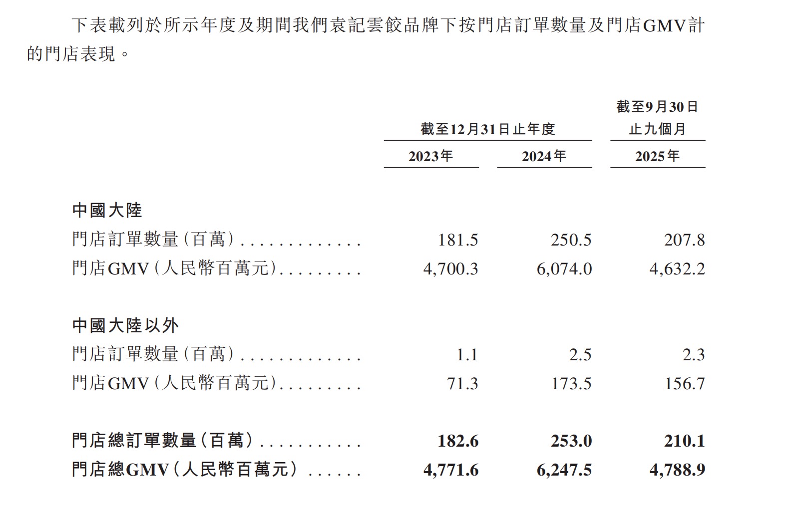 从门店表现来看,2024年全年,袁记云饺门店总订单数达2.53亿单,门店总GMV为62.48亿元。截至2025年9月30日止九个月,其门店总订单数为2.10亿单,门店总GMV为47.89亿元。