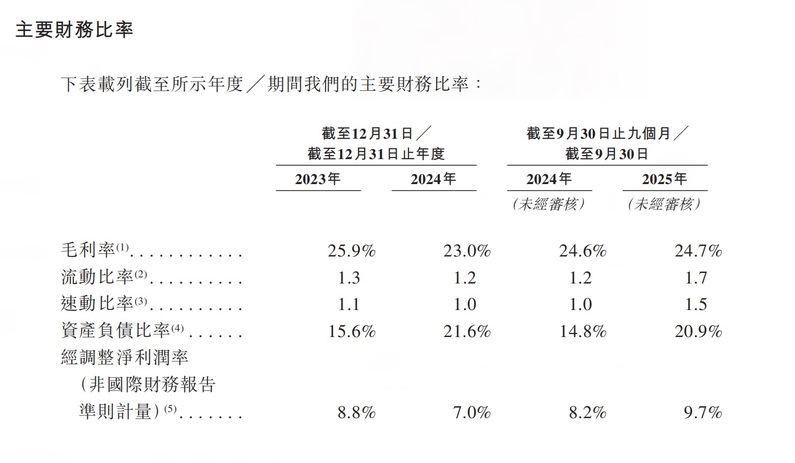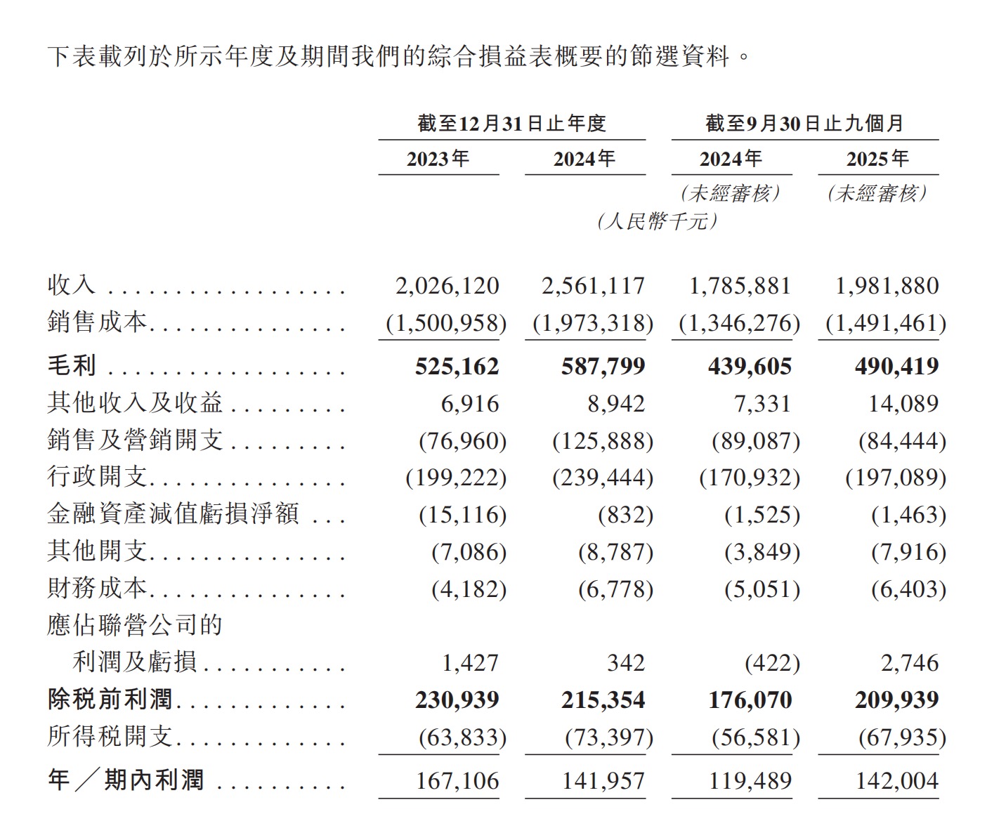 招股书显示,2023年及2024年,袁记食品的经调整净利润(非国际财务报告准则计量)分别为1.79亿元、1.80亿元;截至2025年9月30日止九个月,其经调整净利润为1.42亿元,同比增长18.8%。同时期内,袁记食品的毛利率达24.7%。