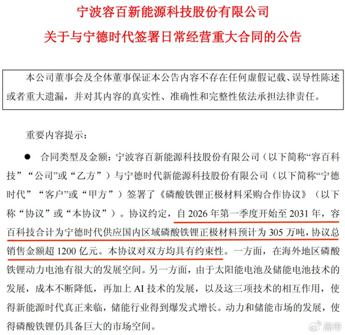 事件起因于1月13日下午,容百科技刊登公告,称与宁德时代签署了磷酸铁锂采购协议,协议总金额超1200亿元。