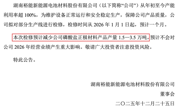 2025年年末,湖南裕能、万润新能、德方纳米、安达科技、龙蟠科技等5家磷酸铁锂上市公司,在一周之内相继公告了减产检修的计划,同期相关企业还宣布上调磷酸铁锂产品加工费。