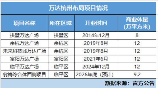 目前,万达在杭州已开业的5座广场中,除最早的拱墅万达广场为重资产项目外,余杭、富阳、未来科技城及临平万达广场均为轻资产模式。