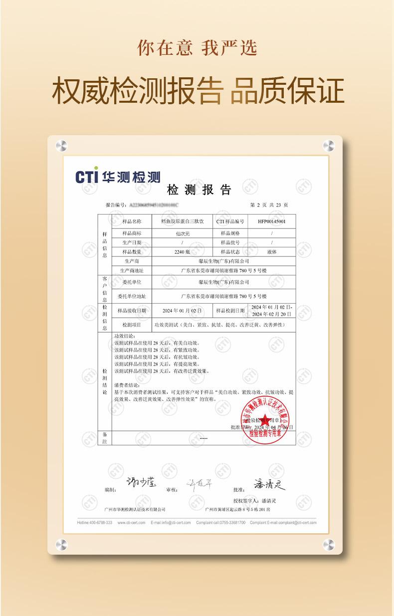 专利 ZL201610093510.7(复合胶原肽配伍技术专利),以科学配比融合多种胶原活性肽,激活成分间的联动效能,全面拉升产品的核心表现力;