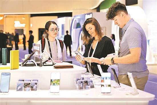 1月20日,“广货行天下”春季行动手机专场活动在东莞启幕。图为国际旅客在手机专柜体验“广东造”手机(资料图)