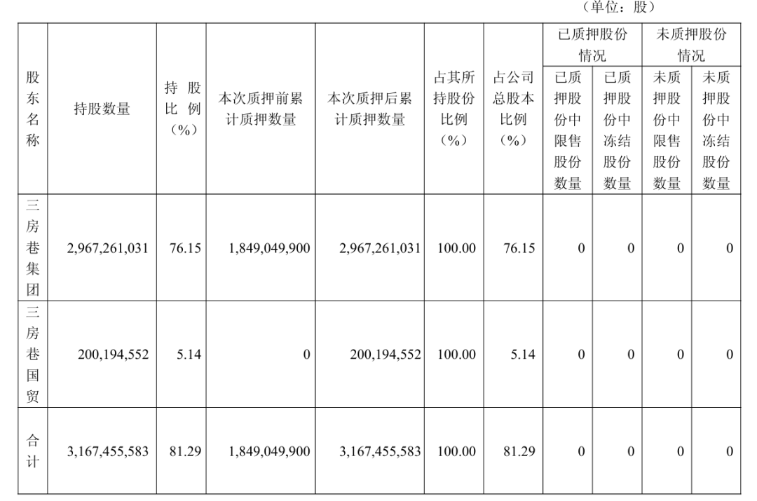 另据三房巷2025年12月26日公告,公司控股股东三房巷集团将其持有的公司8.18亿股、3亿股无限售流通股分别质押给江阴市东吴建设投资有限公司、江苏润元科技小额贷款有限公司;三房巷集团一致行动人三房巷国贸将其持有的公司2亿股无限售流通股质押给江阴市东吴建设投资有限公司,在中国证券登记结算有限责任公司办理了质押登记手续。本次股份质押后,三房巷集团累计质押股份数量为29.67亿股,占其所持有公司股份总数的100.00%,占公司总股本的76.15%。