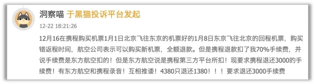 消费者亦苦不堪言。据《蓝筹企业评论》查询,天猫投诉平台关于携程的投诉超16万条,涵盖退款难、乱扣费、杀熟及隐私泄露等。典型案例中,即便航司同意全额退款,携程仍以“航司扣费”为由截留70%手续费。平台既收佣金又不履约,服务缺位却推诿扯皮。