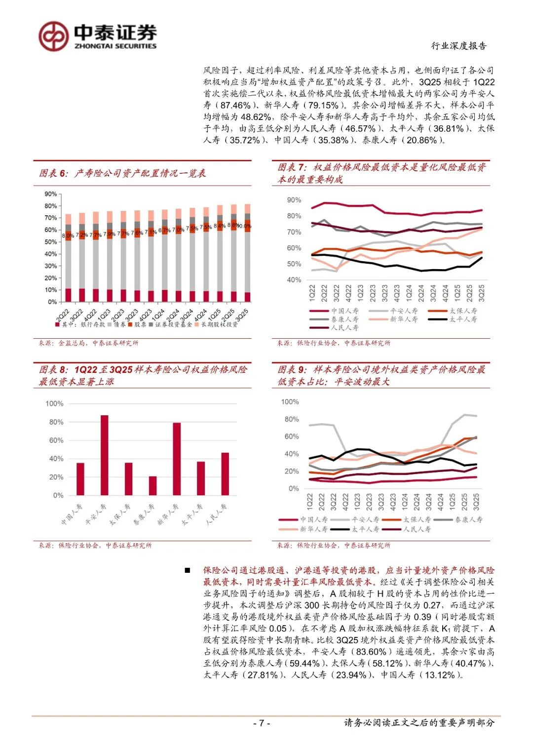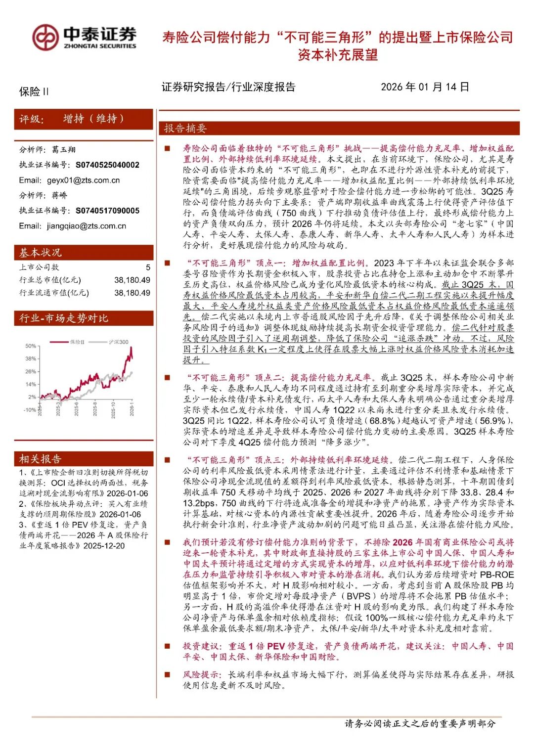 3Q25 寿险公司偿付能力拐头向下主要系:资产端即期收益率曲线震荡上行使得资产评估值下行,而负债端评估曲线(750 曲线)下行推动负债评估值上行,最终形成偿付能力上的资产负债双向压力,预计 2026 年仍将延续。本文以头部寿险公司“老七家”(中国人寿、平安人寿、太保人寿、泰康人寿、新华人寿、太平人寿和人民人寿)为样本进行分析,更好展现偿付能力的风险与破局。