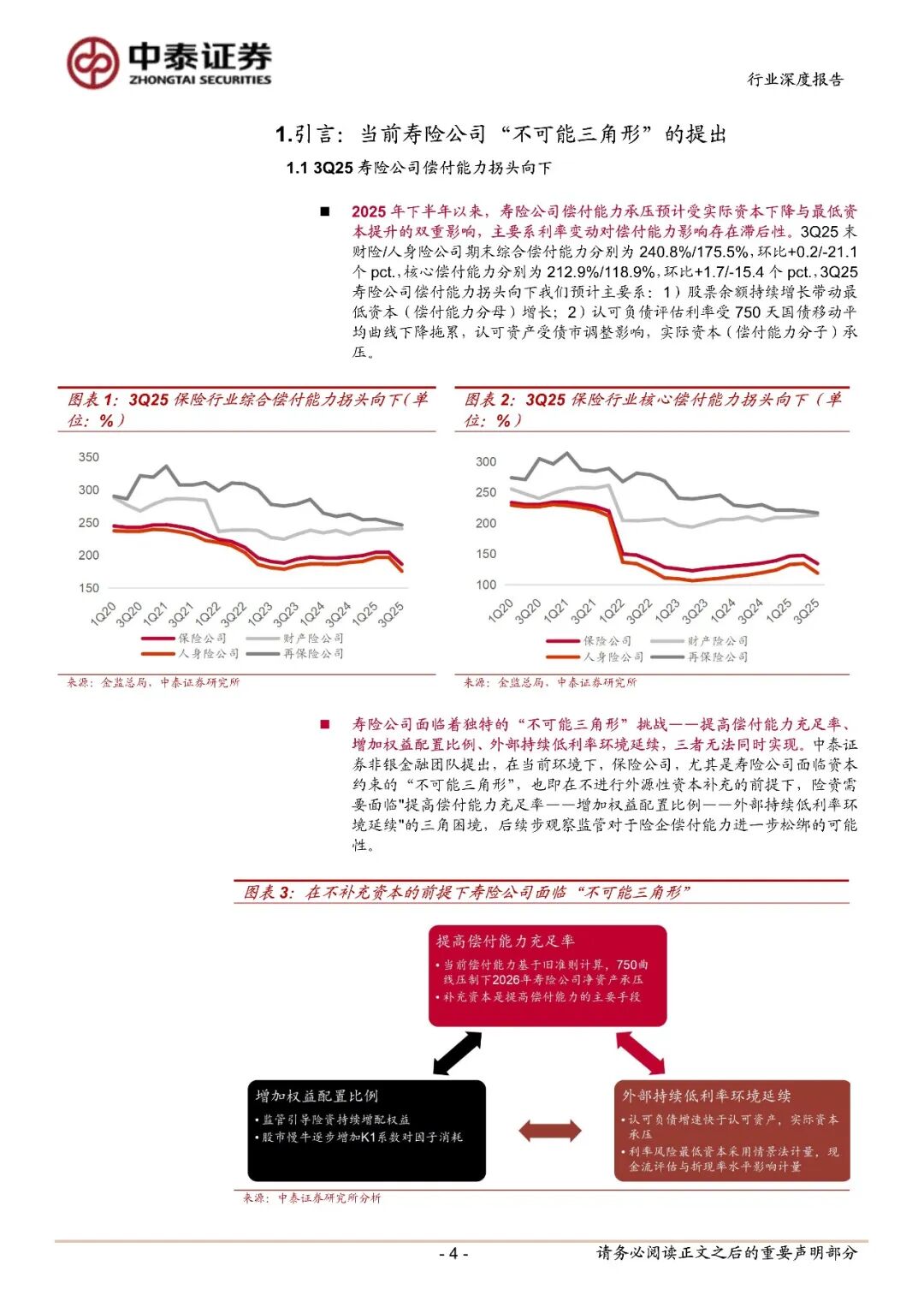 寿险公司面临着独特的“不可能三角形”挑战——提高偿付能力充足率、增加权益配置比例、外部持续低利率环境延续。本文提出,在当前环境下,保险公司,尤其是寿险公司面临资本约束的“不可能三角形”,也即在不进行外源性资本补充的前提下,险资需要面临"提高偿付能力充足率——增加权益配置比例——外部持续低利率环境延续"的三角困境,后续步观察监管对于险企偿付能力进一步松绑的可能性。