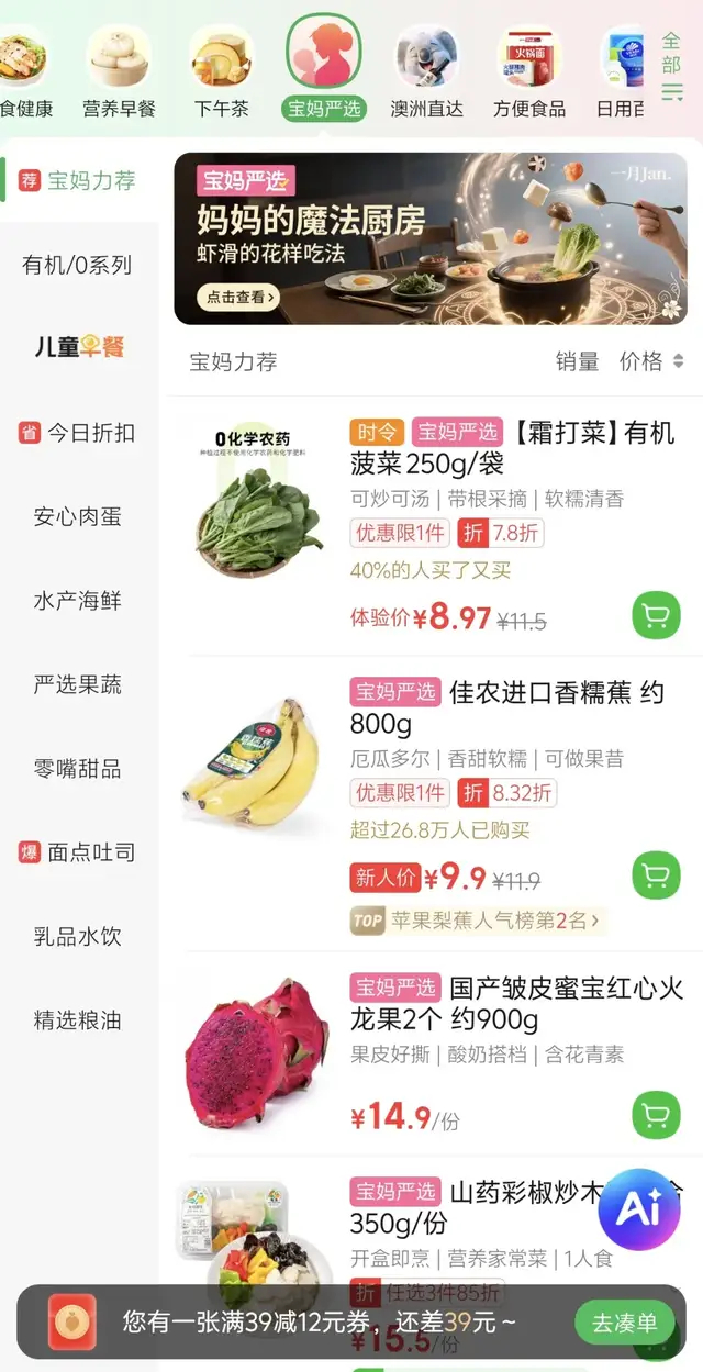 体现在叮咚买菜App改版中,首页新增寻味中国、有机汇、低GI(血糖生成指数)、宝妈严选、配料干净、减脂、澳洲直达等「品质之爱」专区。与此同时,平台2025年上半年淘汰了4216支商品,将「好商品」的SKU占比提升到40%,其中,「宝妈严选」商品销售额上半年大盘占比7%,用户复购率近8次,是平台用户平均复购率的2倍。