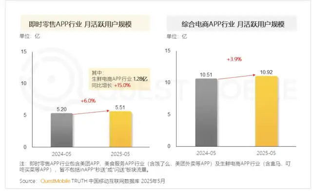 此前有数据测算,目前一线城市的即时零售渗透率约为50%,而下沉市场约为10%。而随着互联网巨头的「闪购」们激烈争夺即时零售,生鲜零售作为其中一个高频品类,亦从中受益。据QuestMobile2025年5月数据,生鲜电商APP行业月活用户规模同比增长了15%、达到1.28亿。