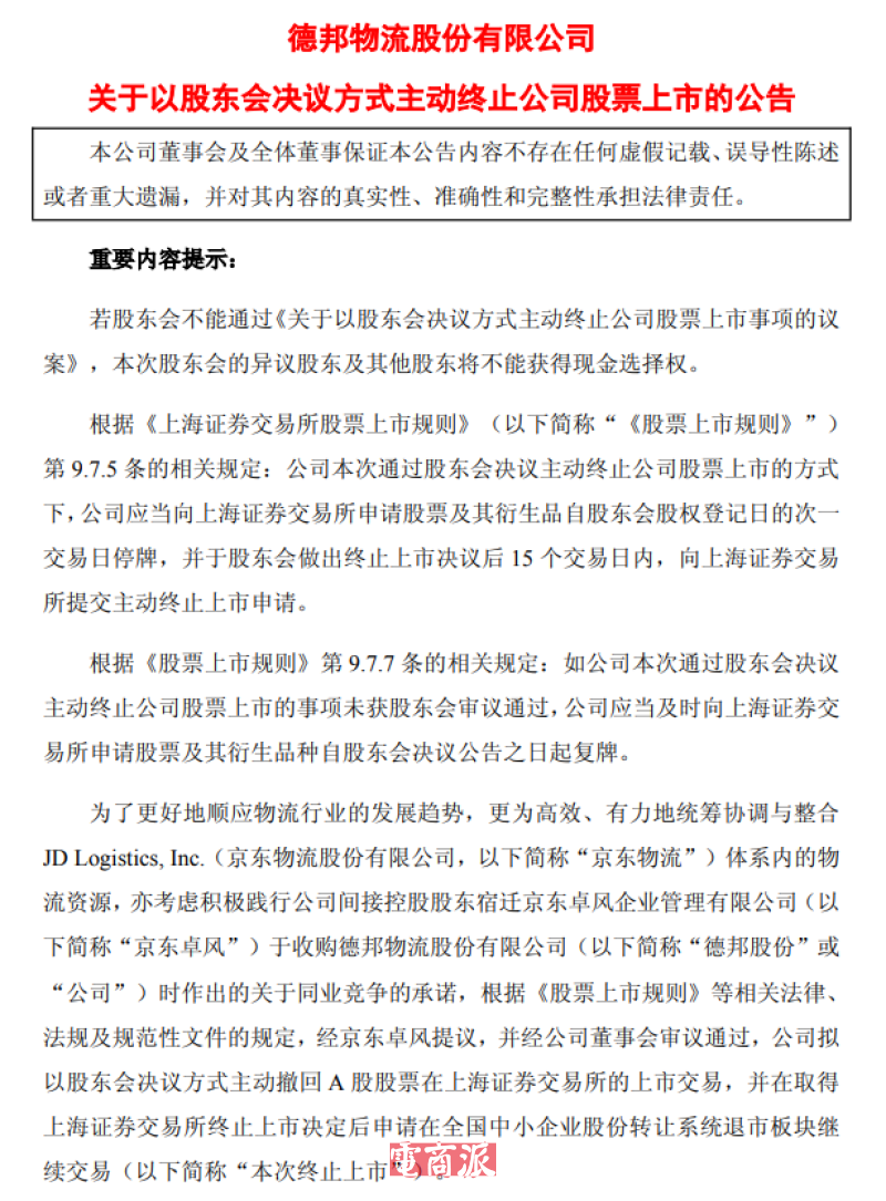 结果没想到,德邦在1月13日深夜突然发布公告,宣布将主动撤回德邦股份A股股票在上海证券交易所的上市交易,并在后续申请在全国中小企业股份转让系统(老三板)退市板块继续交易。