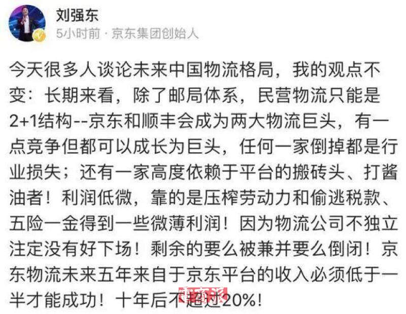 刘强东:未来快递就两家,京东和顺丰。