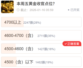 然而,黄金调查则上演着“乐观者的滑铁卢”!市场集体陷入高位看涨幻想,4600-4700(含)区间以35%支持率领跑,4700以上激进看涨派也占28%,两大高位合计获得63%选票。谁料黄金周五最终收官价定格4595,仅18%用户慧眼识珠押中结果,因过度放大避险情绪踩空,诠释“情绪上头比实际行情更疯狂”。