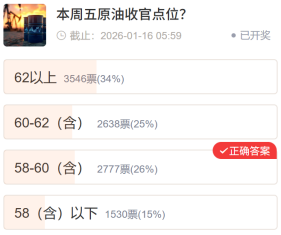 原油调查显示34%用户押注62以上高位,期待地缘风险再掀涨幅,进一步推高油价,但供应端压力对价格形成了显示约束。最终,纽约原油收于59.22,落在58-60(含)区间,获26%用户支持率,与60-62区间25%支持率几乎持平,而58以下看空派仅15%。成功命中的用户似乎更侧重成本支撑和供需结构的判断,将奖品收入囊中。