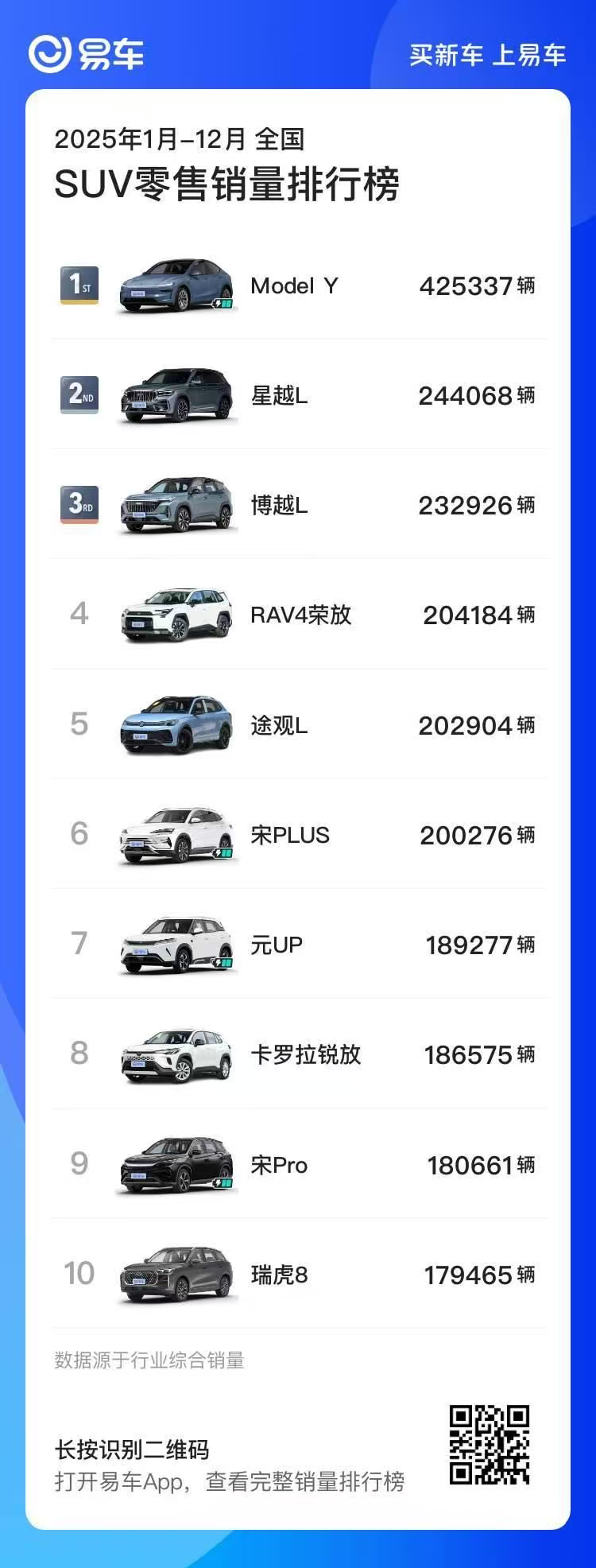 特斯拉Model Y成2025年最畅销SUV,比亚迪未进前五