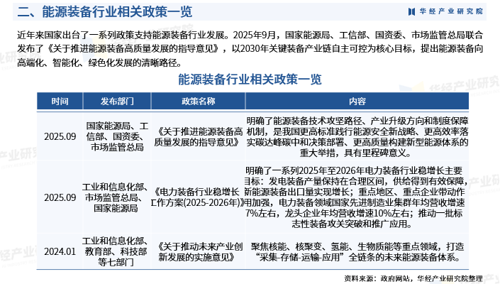 近年来国家出台了一系列政策支持能源装备行业发展。2025年9月,国家能源局、工信部、国资委、市场监管总局联合发布了《关于推进能源装备高质量发展的指导意见》,以2030年关键装备产业链自主可控为核心目标,提出能源装备向高端化、智能化、绿色化发展的清晰路径。