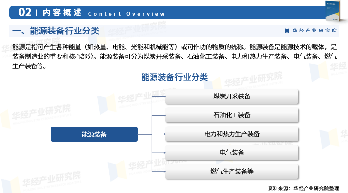 能源是指可产生各种能量(如热量、电能、光能和机械能等)或可作功的物质的统称。能源装备是能源技术的载体,是装备制造业的重要和核心部分。能源装备可分为煤炭开采装备、石油化工装备、电力和热力生产装备、电气装备、燃气生产装备等。