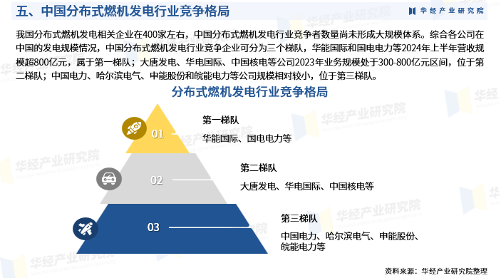 我国分布式燃机发电相关企业在400家左右,中国分布式燃机发电行业竞争者数量尚未形成大规模体系。综合各公司在中国的发电规模情况,中国分布式燃机发电行业竞争企业可分为三个梯队,华能国际和国电电力等2024年上半年营收规模超800亿元,属于第一梯队;大唐发电、华电国际、中国核电等公司2023年业务规模处于300-800亿元区间,位于第二梯队;中国电力、哈尔滨电气、申能股份和皖能电力等公司规模相对较小,位于第三梯队。