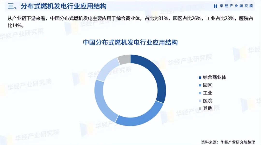 分布式燃机发电产业链上游主要包括天然气开采、储运,以及分布式燃机发电设备制造等环节;中游包括分布式燃机发电项目工程设计、建设、运营等;下游包括园区、工业建筑、商业建筑、医院、数据中心等应用领域。从产业链下游来看,中国分布式燃机发电主要应用于综合商业体,占比为31%,园区占比26%,工业占比23%,医院占比14%。