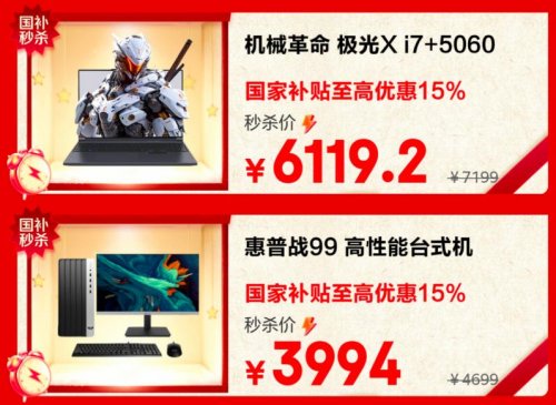 若您计划将电脑这类提升生产力与娱乐体验的“大件”列入清单,本次电脑品类的优惠同样诚意十足。堪称馈赠电竞玩家硬核之选的机械革命极光X游戏本,秒杀价仅6119.2元;而对办公与多任务需求人群,惠普战99 高性能台式机叠加国家补贴,最高可享15%优惠,到手价低至3994元,稳定高效,轻松胜任日常工作与创作。