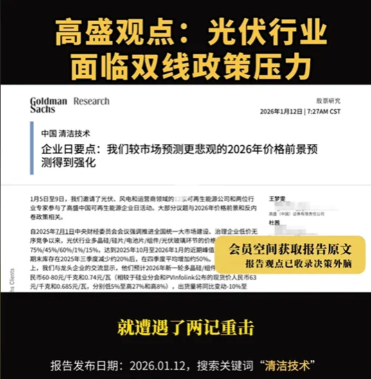 对于今年中国光伏行业的发展预期,高盛曾在1月12日发布了《中国清洁技术行业:企业日要点,我们较市场预测更悲观的2026年价格前景预测得到强化》的研报。