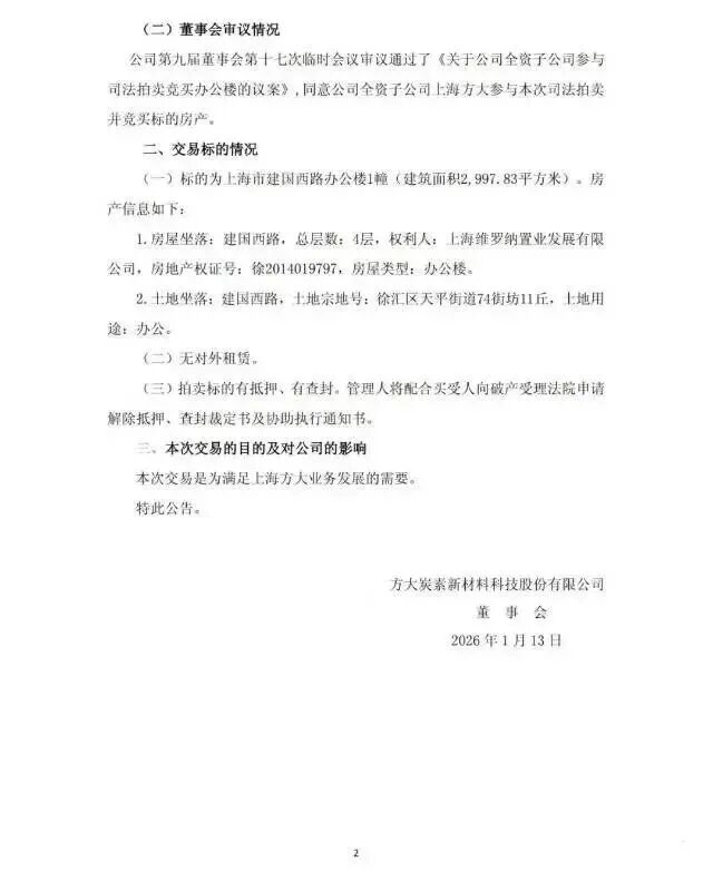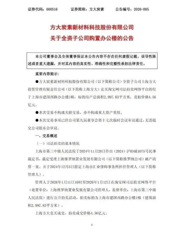 2026年1月,上市公司方大炭素发布公告,其全资子公司上海方大投资管理有限责任公司通过司法拍卖,以4.56亿元竞得位于上海市建国西路的一幢办公楼,建筑面积2997.83平方米。
