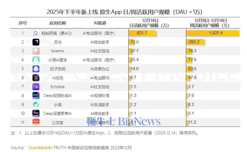 公开数据显示,灵光 App 自 2025 年 11 月上线以来,已进入 QuestMobile 2025 年周活跃用户 AI 原生 App 前十。官方披露,其上线一个月内,用户累计创建约 1200 万个闪应用。