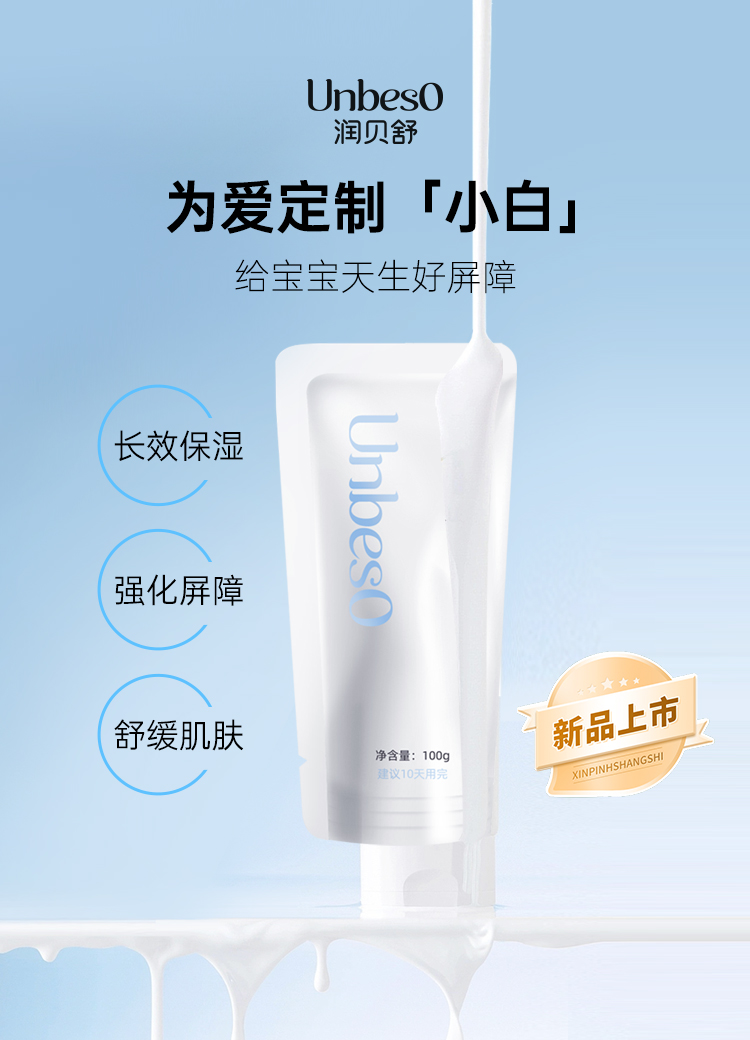 公司旗下婴童功效型护肤品牌【润贝舒UNBESO】(团队内部称它为“小白”),经由公司内三位宝妈携手研发的“润贝舒神经酰胺屏障霜”,已正式于2026年1月15日正式登陆天猫、京东、抖音等电商平台。