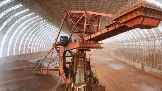 16万平方米的棚仓,长度达855米,约等于22.4个标准足球场,堆放的铁矿粉等钢铁原料数量巨大。这些原料在运输过程中易产生粉尘,特别是斗轮机启动后,它会像水车一样不断将铁矿粉等原料运输到皮带上,供下一个环节使用。在这过程中,挖掘机、铲车、渣土车等工程车辆不时会协同作业,产生更多的粉尘源,导致粉尘浓度升高。