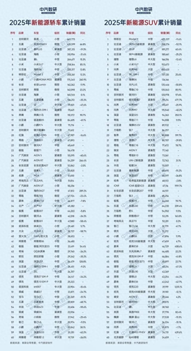 2025年新能源汽车累计销量榜